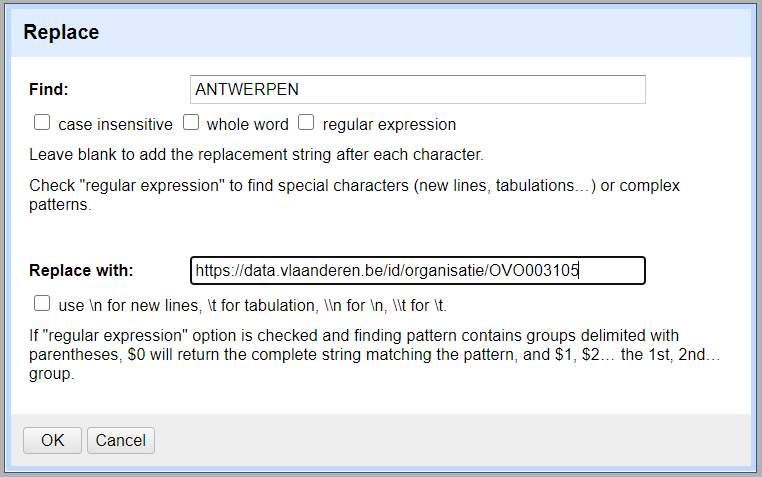 Het algemene idee van Linked Data is dat men van data gemakkelijk naar andere data kan doorverwijzen, gelijkaardig aan hoe hyperlinks op het World Wide Web de ene webpagina aan de andere linken. Hier maken we gebruik van Wegwijs, een databron met informatie over publieke organisaties, om de URI van het District Antwerpen (https://data.vlaanderen.be/id/organisatie/OVO003105) terug te vinden. Vervolgens kunnen we dan de tekstwaarde "District Antwerpen" in de kolom [DISTRICT] van onze voorbeeldataset vervangen door diens semantisch waardevollere URI, via de functie Edit cell > Replace.