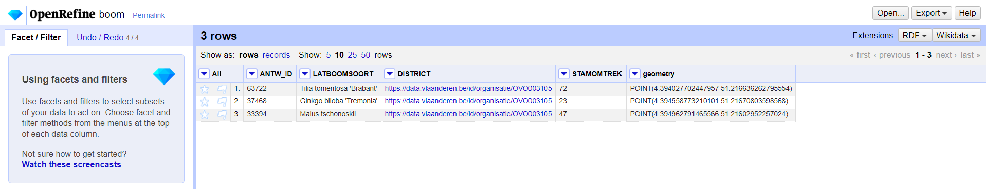 We importeren de data uit Tabel 1 (in .csv-formaat) in OpenRefine en maken een project aan. De tabulaire data moet zo geordend zijn zodat elke rij één object (bv. een Boomvorm) beschrijft en elke kolom een eigenschap van dat object (bv. stamomtrek). De figuur hieronder geeft de geïmporteerde data weer. Via deze link kan je de dataset met de gegevens over deze drie bomen downloaden.