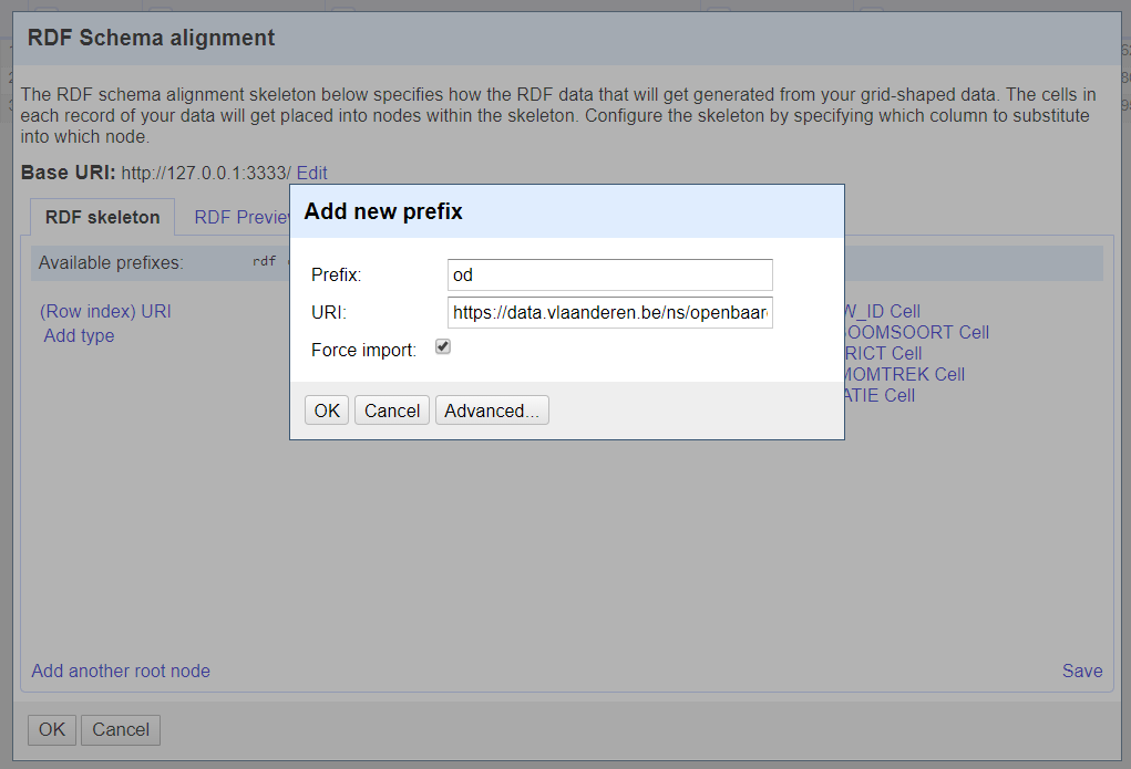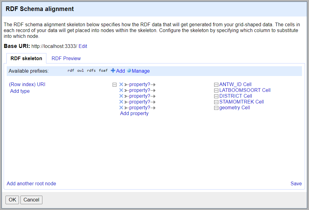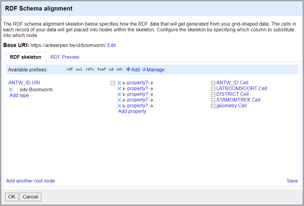 Nu dat stappen 1 tot 3 zijn uitgevoerd, kunnen we beginnen met onze voorbeelddataset semantisch te verrijken door alle data te mappen naar de relevante concepten uit OSLO Openbaar Domein. Dit doen we via de RDF-extensie en meer specifiek, de functie Edit RDF Skeleton. Deze functie opent een venster waarin we de volledige mapping kunnen specifiëren.