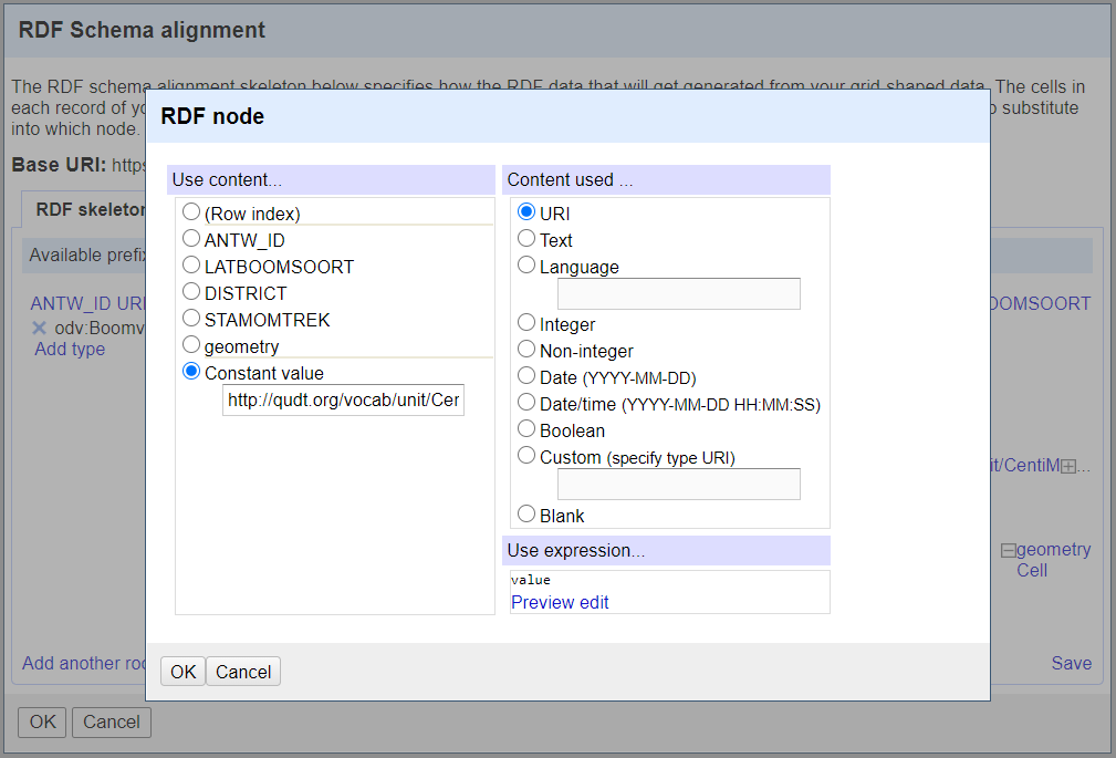 Vervolgens moeten we bepalen welke eigenschap gebruikt zal worden om de base URI te vervolledigen om een unieke URI te kunnen creëren per instantie. Dit kan via de functie (Row index) URI. In ons voorbeeld gebruiken we de kolom ANTW_ID om unieke URI’s te creëren per Boomvorm. Een URI van een Antwerpse boom wordt dus bijvoorbeeld https://antwerpen.be/id/boomvorm/63722.