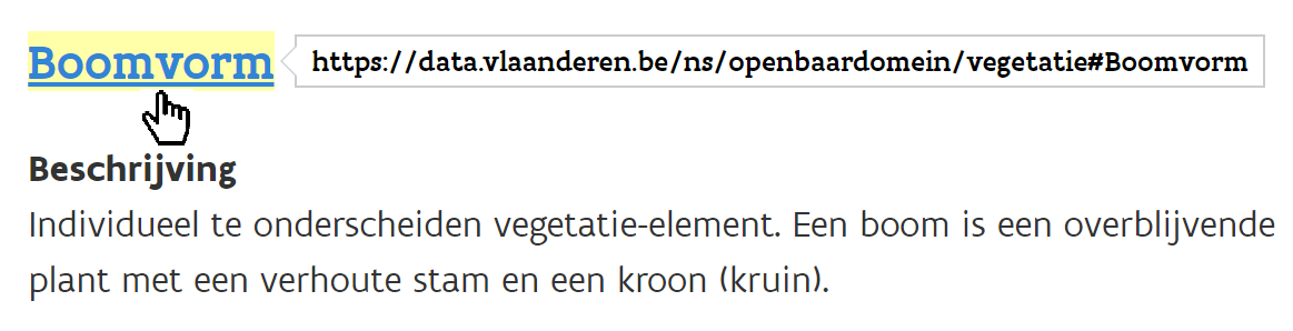 Door in de applicatieprofielen over de concepten te hoveren met de muis, wordt de URI van het concept zichtbaar. Door erop te klikken, word je doorverwezen naar het vocabularium waar de respectievelijke term beschreven staat. Merk op dat dit zowel een OSLO-vocabularium kan zijn (bv. voor Boomvorm - zie figuur 3) als een extern vocabularium (bv. voor wetenschappelijke naam - zie figuur 4).