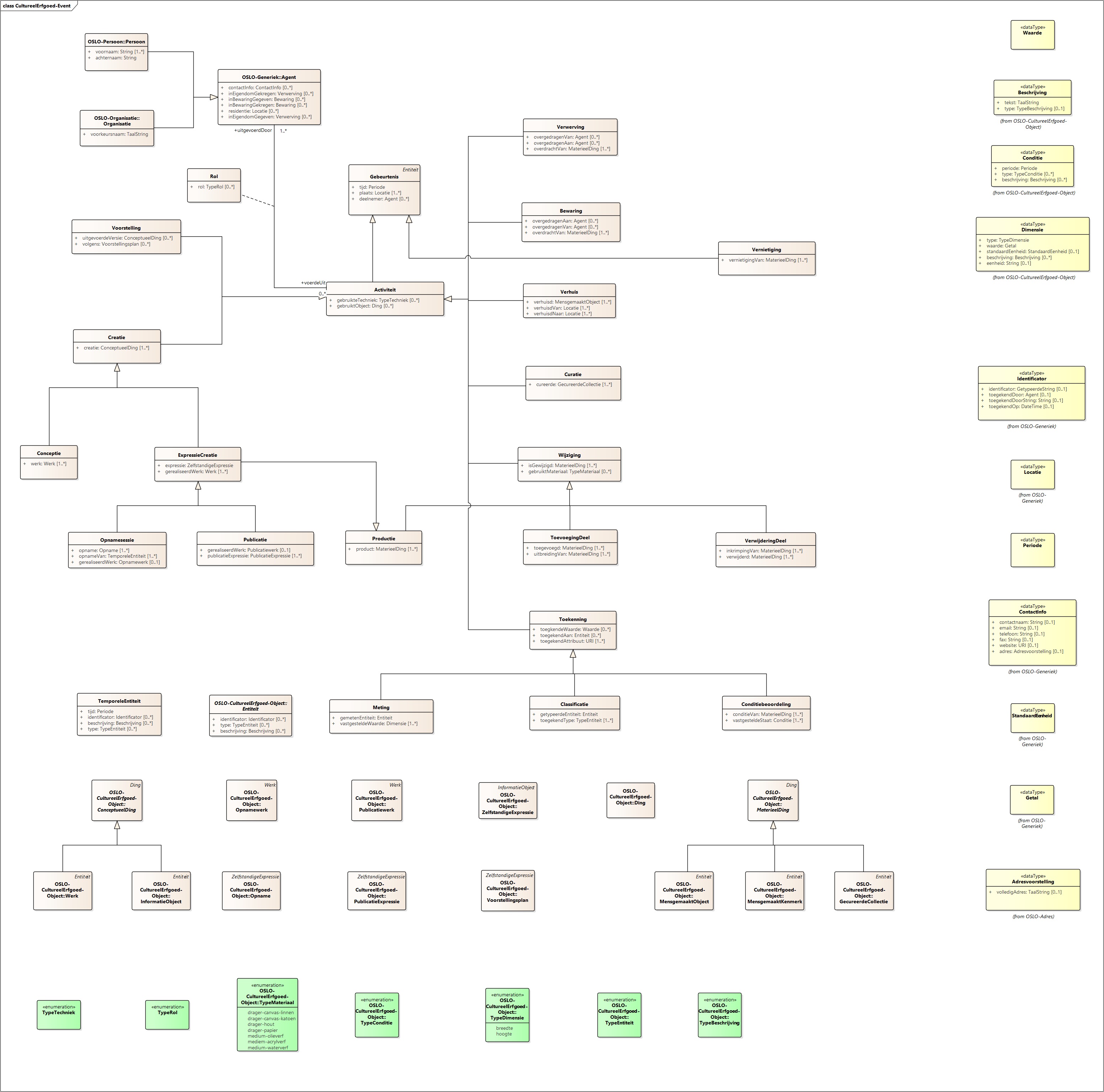 Klassen in het applicatieprofiel OSLO-CultureelErfgoed-event zijn specialisaties van de abstracte klasse Entiteit en erven daarvan kenmerken zoals identificator, beschrijving of type over.
