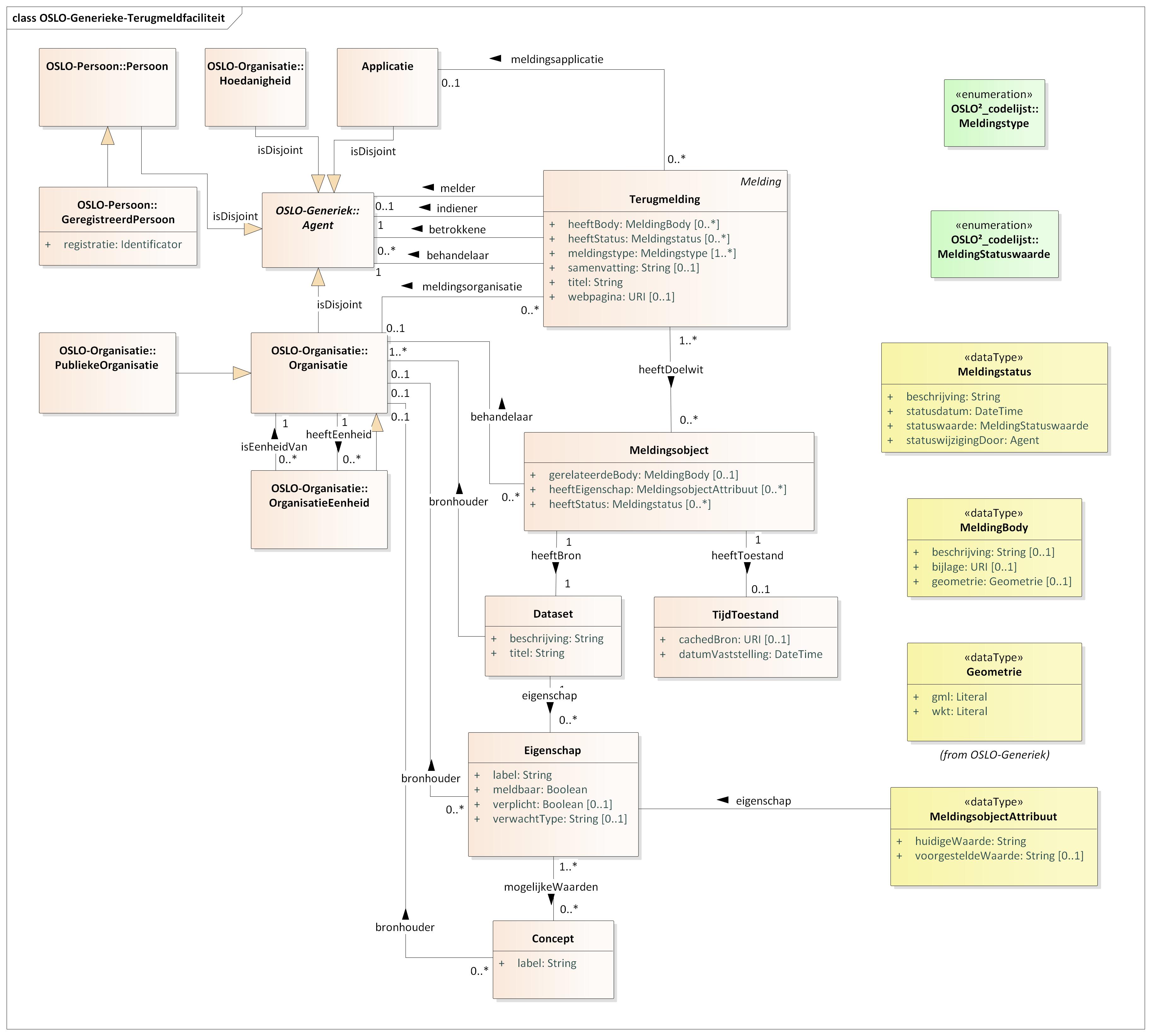 Specifiek aan een Terugmelding is de relatie met een Meldingsobject dat het doelwit vormt van de Terugmelding. Een Meldingsobject identificeert een resource of een specifiek deel van een resource waarop de Terugmelding slaat, én laat toe om een voorgestelde of gecorrigeerde waarde mee te geven. Bijvoorbeeld een Terugmelding met betrekking tot een fout in het Adresregister zal als Meldingsobject een bepaalde record bevatten waarin de fout is vastgesteld, of een specifiek deel daarvan zoals bijvoorbeeld het huisnummer. Een Meldingsobject heeft dus een bepaalde bron (in ons voorbeeld het Adresregister), in dit model gespecifieerd als een Dataset. Daarnaast heeft een Meldingsobject een TijdToestand die informatie meegeeft over het tijdstip waarop het Meldingsobject dient geïnterpreteerd te worden, aan de hand van een datum van vaststelling (van de fout of onvolledigheid). Een Meldingsobject kan een bepaalde behandelaar hebben die verantwoordelijk is voor de opvolging en afhandeling ervan. Wanneer een Terugmelding betrekking heeft op meerdere Meldingsobjecten, kan elk Meldingsobject een andere behandelaar toegewezen krijgen. In dit laatste geval zal er ook een status mogelijk zijn op niveau van het Meldingsobject, die via bepaalde business regels vertaald zal moeten worden naar een status op niveau van de Terugmelding. Deze business rules zijn toepassing specifiek en vallen dus buiten de scope van dit informatiemodel. Als voorgestelde codelijst wordt opnieuw verwezen naar de lijst met mogelijke statussen uit de Generieke Terugmeldfaciliteit (GTMF) van Informatie Vlaanderen.