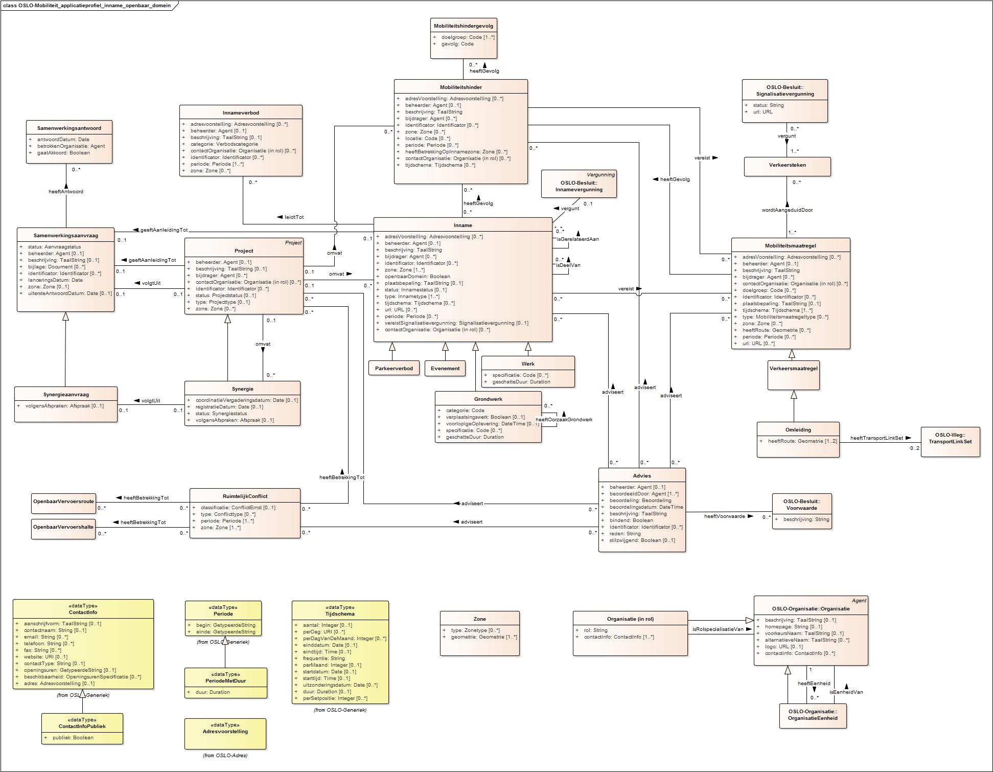 Verder beschrijft dit model componenten (Samenwerkingsaanvraag, Synergie, Conflict, Advies, Innameverbod...) die voor een betere afstemming tussen partijen zorgt. Merk op dat codelijsten hiervoor verder bekeken zal worden in de business werkgroepen. Via Inname, Signalisatie en Mobiliteitsmaatregel is er een rechtstreekse link met de vergunning enerzijds en het aanvullend reglement anderzijds. Ten slotte bouwt Omleiding voort op OSLO-Weg.